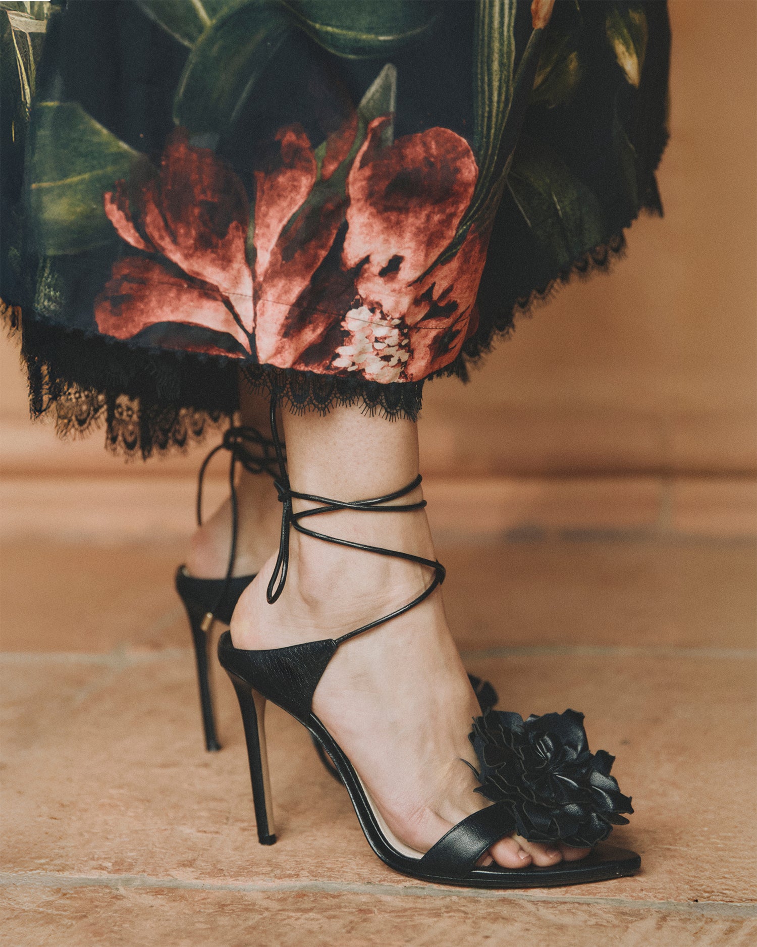 The Ornela Sandal 100 Black features an exuberant artisanal flower embellishment and a refined 100 mm stiletto heel, crafted from luxurious leather. This elegant design delivers a sophisticated statement with exquisite handcrafted details and timeless allure.